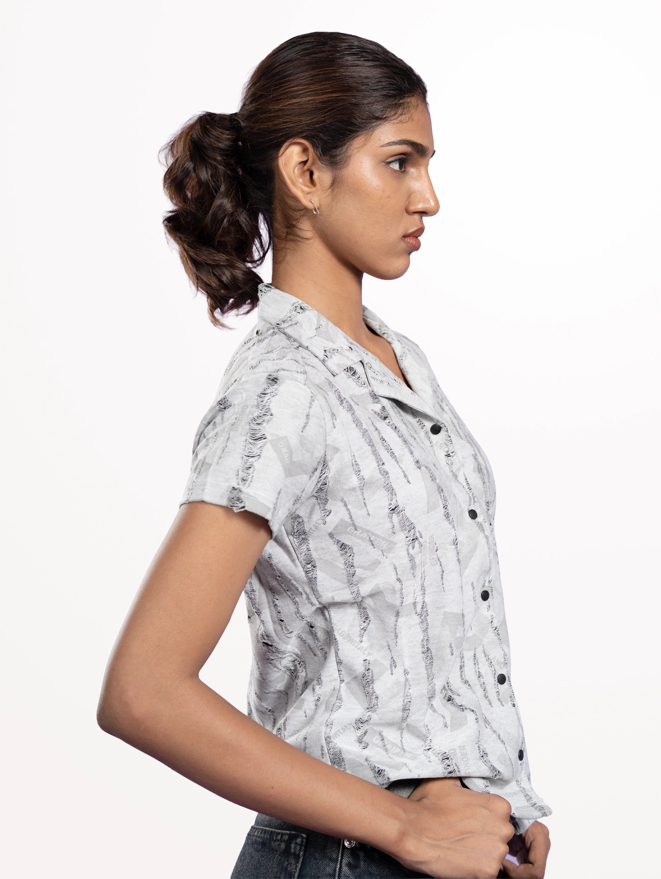 Choose the Women's Rugs Printed Cuban Collar Shirt in Grey for versatile styling and standout patterned appeal.